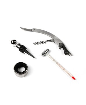Set de vino redondo con accesorios metálicos, incluye: saca corcho, boquilla, corcho metálico y corta gotas. -