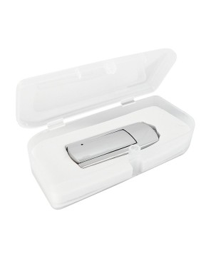 Memoria USB de 8 GB, fabricada en plástico con protector de aluminio. Incluye estuche de plástico y colgante. -