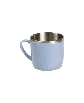 Taza térmica de en acero inoxidable doble pared, con asa y tapa de polipropileno (PP). Fabricado en materiales de grado alimenticio, mantiene bebidas frías o calientes por un largo tiempo, no usar en microondas, capacidad 390 ml. Incluye caja de cartón individual.
