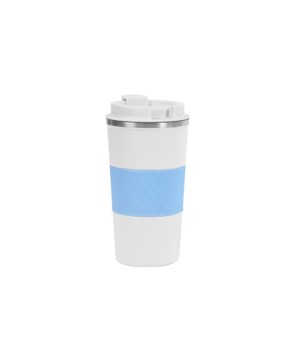 Taza de cerámica con base de corcho y tapa deslizable de PP (Polipropileno). Capacidad 400ml. Incluye caja de cartón individual.